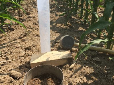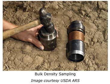 Bulk density is the mass of mineral and organic soil particles divided by the total volume they occupy. It serves as a key indicator of soil compaction and overall soil health, influencing how rapidly water infiltrates the soil and helping identify areas of concern. Bulk density affects rooting depth, available water capacity, soil porosity, nutrient availability, and microbial activity—all of which shape essential soil processes and productivity.